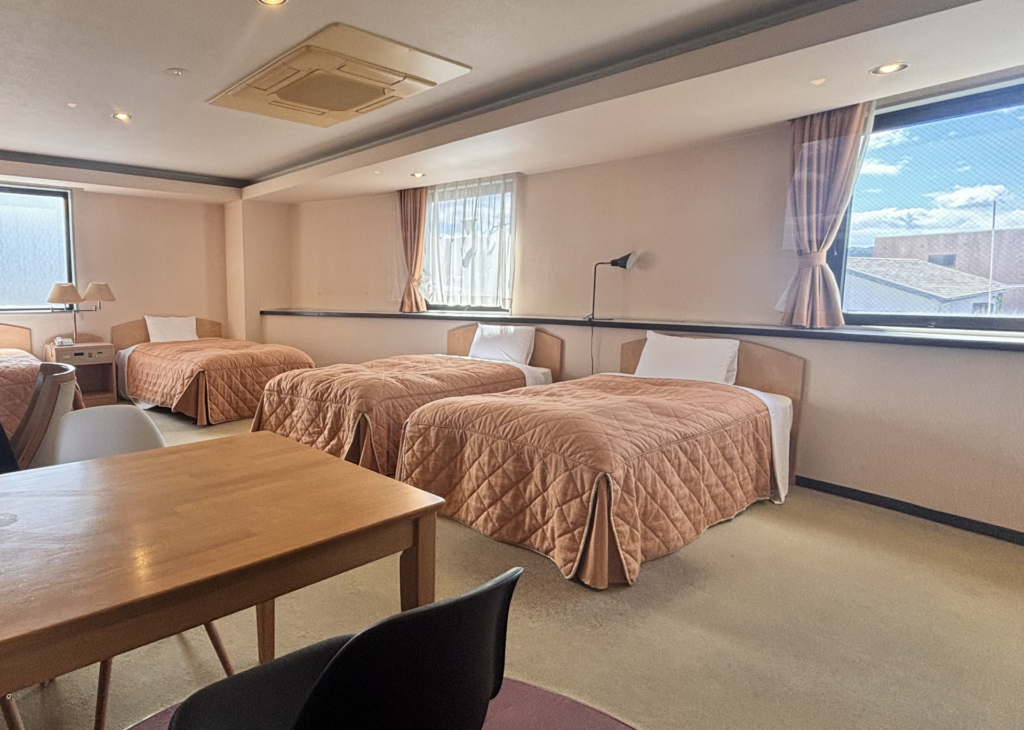 ご家族やグループでのご滞在に最適なファミリールームは、ゆったりとした空間と機能性を兼ね備えたお部屋です。ベッドを複数配置し、お子さま連れでも安心してお過ごしいただけます。ビジネスホテルならではの快適な設備と清潔感はそのままに、観光や帰省、連泊にも便利。全室Wi-Fi完備で、滞在中もストレスなくお使いいただけます。